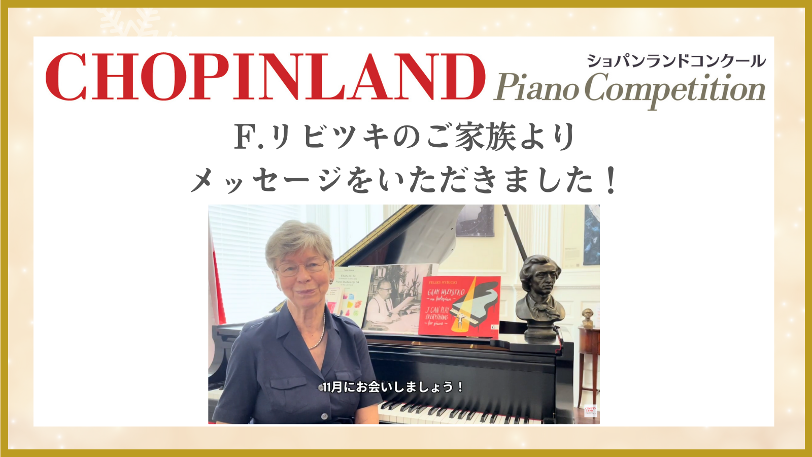 【リビツキ賞】F.リビツキご家族より、メッセージをいただきました! 2025年10月17日金曜日 2025年度本選には、F.リビツキ氏のご家族(娘)であるバルバラ・カラビンスキ(Barbara Kalabinski)さんが来日予定です。 カラビンスキさんより、ショパンランドコンクールにご参加される皆さまへビデオメッセージが届きました!ぜひご覧ください。 ビデオメッセージ ※YouTubeチャンネルにジャンプします。 また、ご家族の来日を記念し、今年限定の特別賞として「リビツキ賞」を新設しました。 受賞者の皆さまは、11月25日(火)に駐日ポーランド共和国大使館で開催される 「受賞者レセプション&コンサート」へご招待いたします。 詳しくは、下のボタンからご確認ください↓ リビツキ賞について この記事をシェアする Facebookでシェア Twitterでシェア LINE でシェア 前の投稿 こちらの記事も読まれています